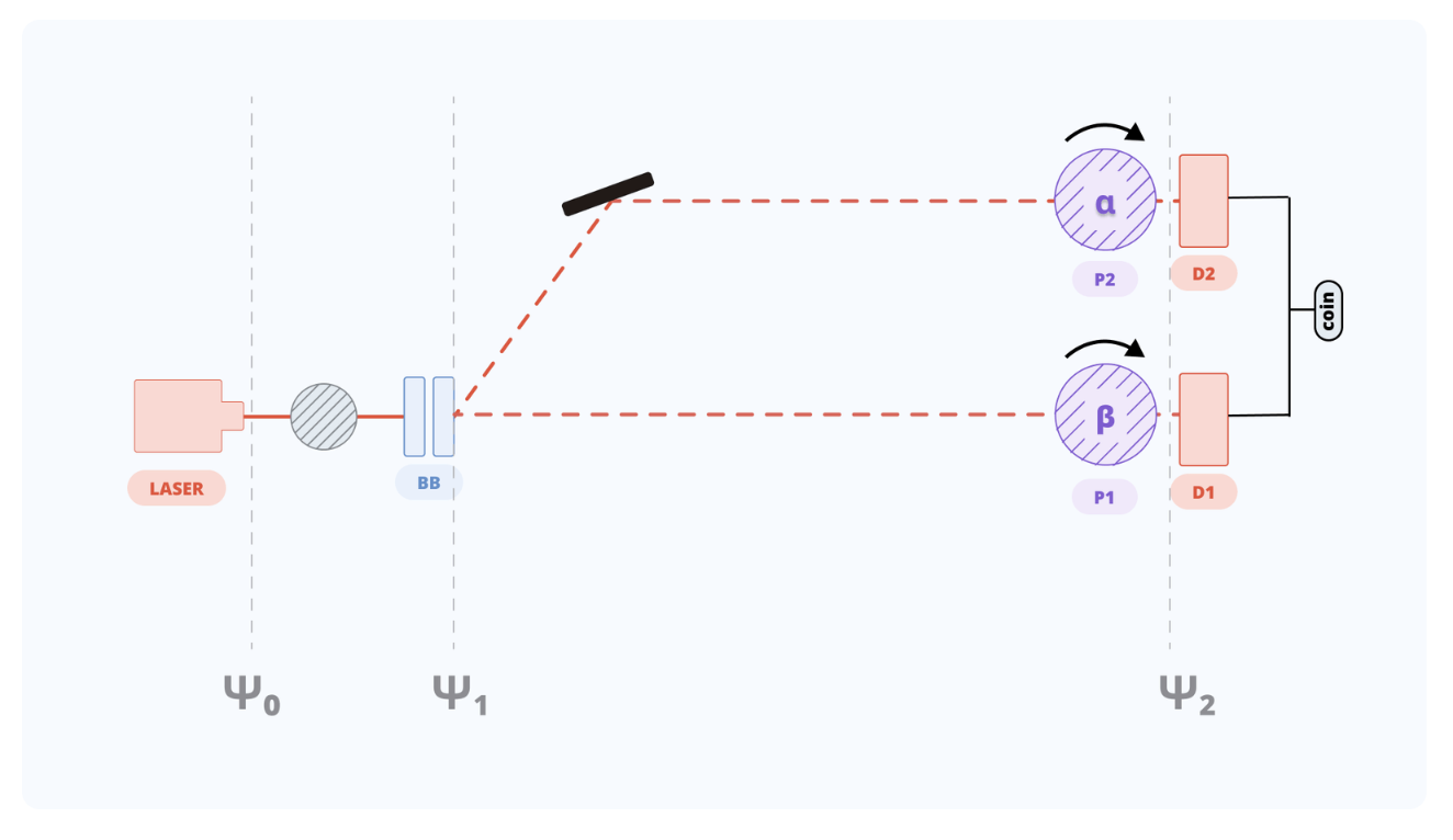 Each photon passes through a polarizer mounted on a motorized rotation stage. Since the polarizer can be set to any angle, we denote the angles by Greek letters: $\alpha$ for one polarizer, $\beta$ for the other.